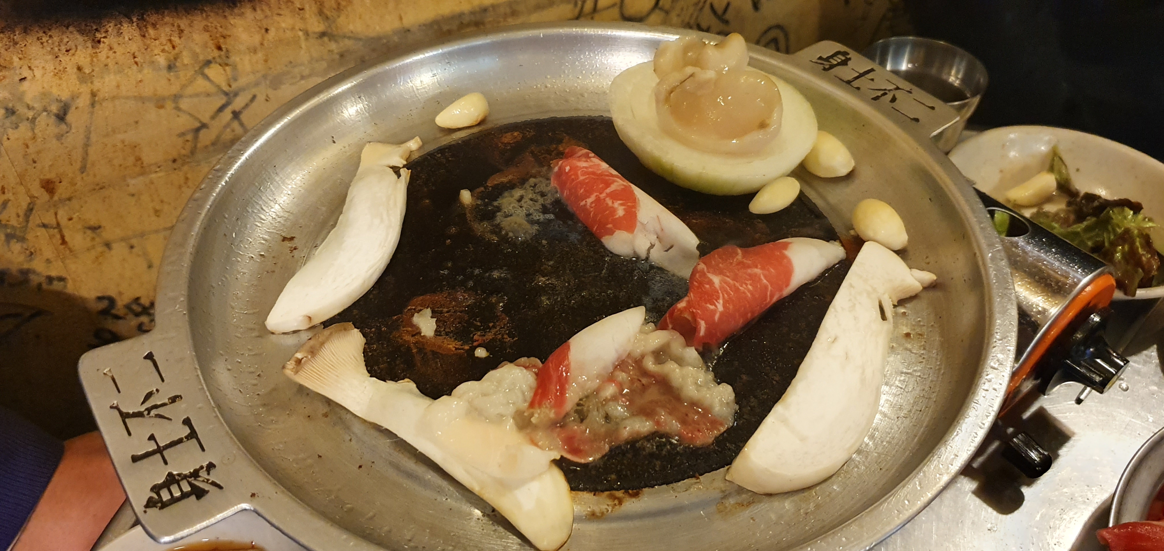 고기+묵은 지+관자의 삼합이 맛있다고 하는데 김치 맛이 매우 강합니다. 고기, 관자, 김치 따로 먹었습니다ㅋㅋㅋ 먹는 건 개인 취향이니까~