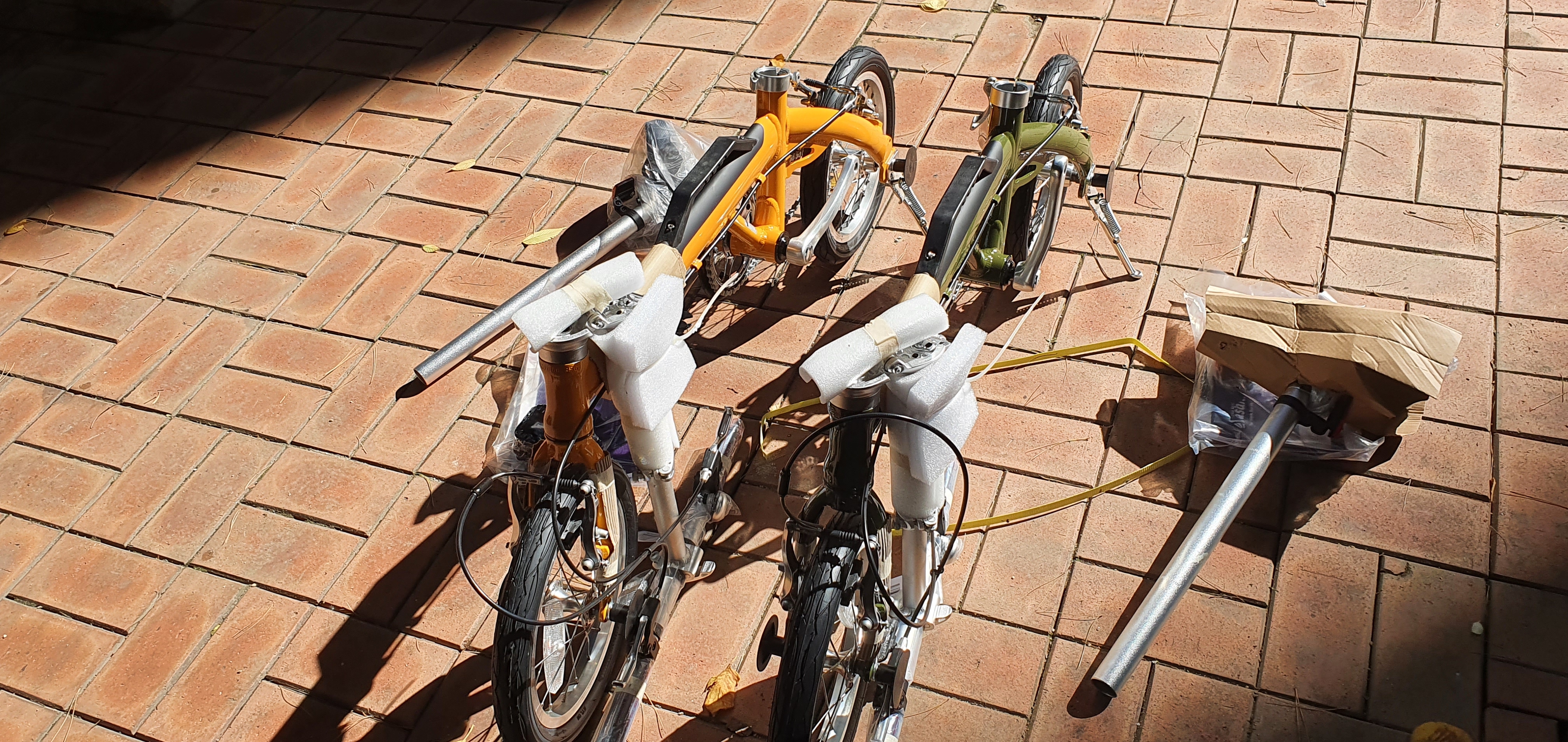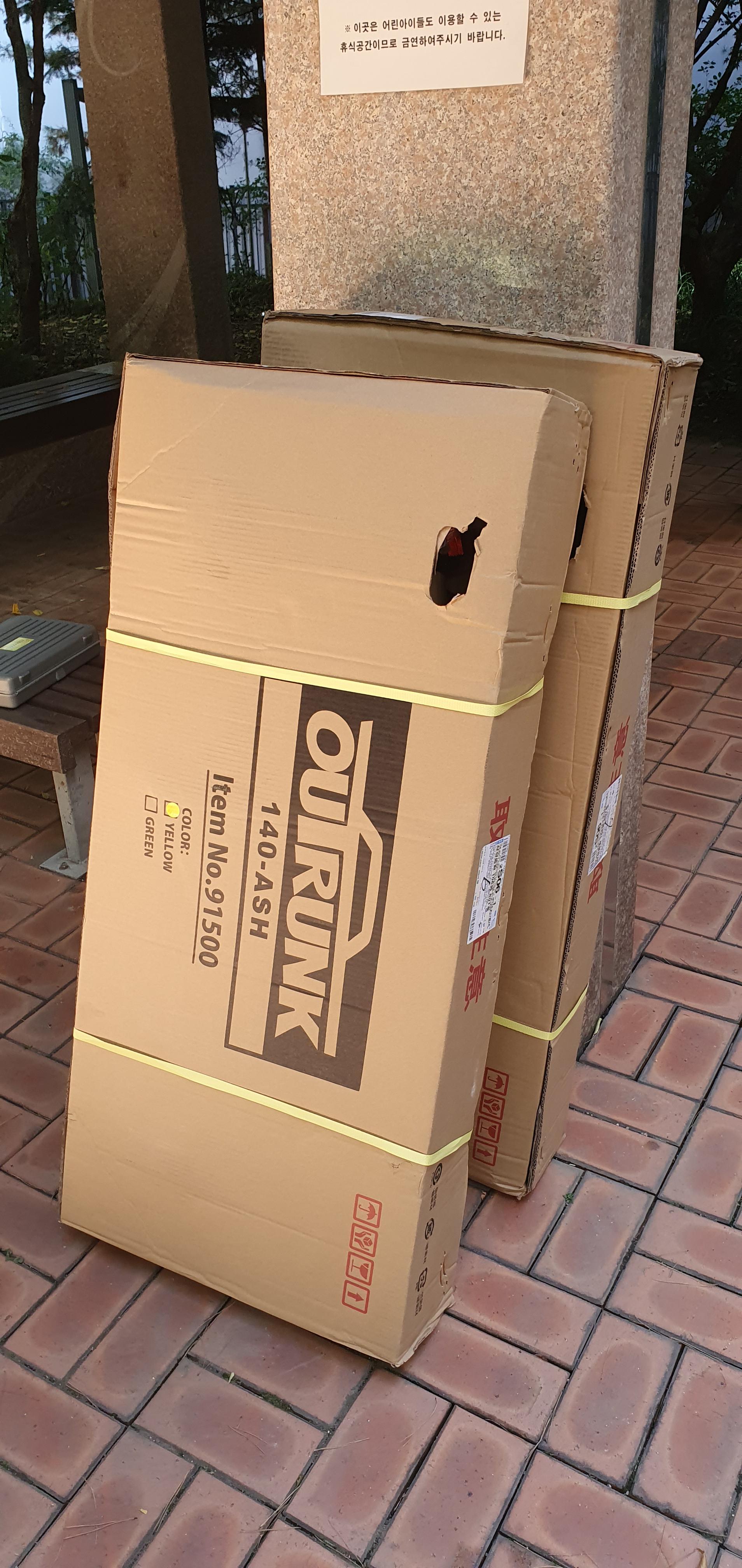 이렇게 큰 박스가 두 개가 왔는데 8킬로짜리 자전거여서 그런가 비교적 쉽게? 들 수 있다. 조립도 매우 간단하다 바퀴 달고 그런 거 없이 그냥 페달과 안장만 꼽으면 끝 오히려 포장 벗기는 게 너무 힘들었다 꼼꼼하게 포장해 주시더라. 두대 조립하는데 30분 정도 소요되었는데 포장 벗기고 재활용 분류해서 버리는 시간 포함이다.