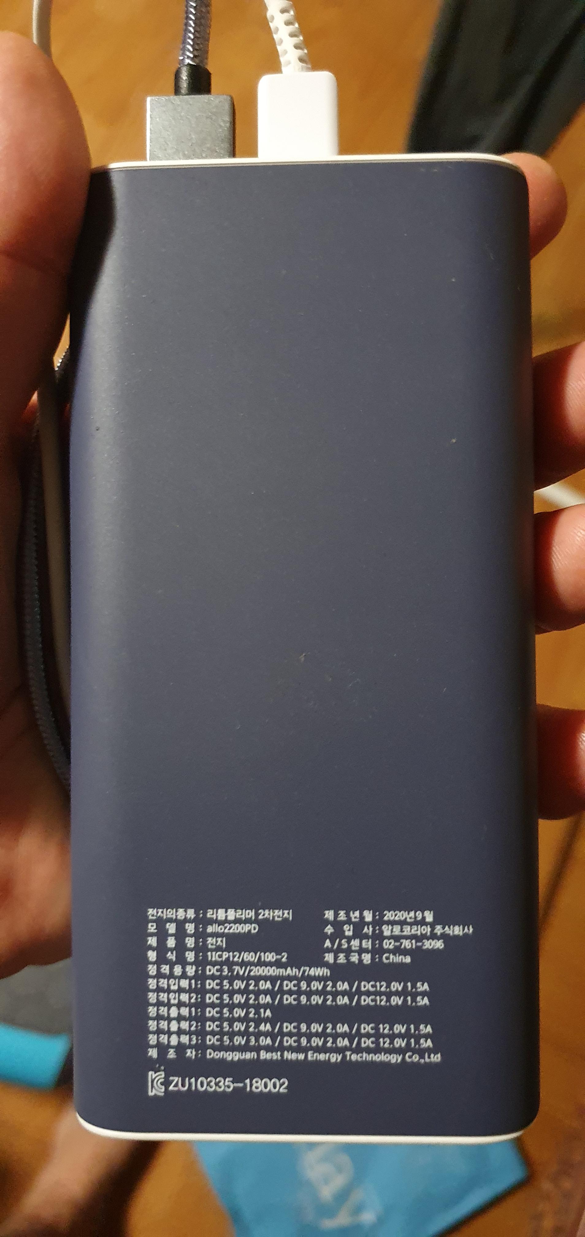 그래서 용량이 큰 배터리를 알아보게 되었고 기왕이면 안전하게 사용할수 있는 리튬폴리머를 검색하게 되었다. 그러다 발견한 배터리가 "알로코리아 고속충전 보조배터리 20000mAh 1000iQCPD" 이다 가격도 25000원 정도로 저렴하고 무엇보다 동시에 3대를 충전할수 있다는점 c타입, 마이크로5핀 으로 input이 된다는 점이 매력적이다.