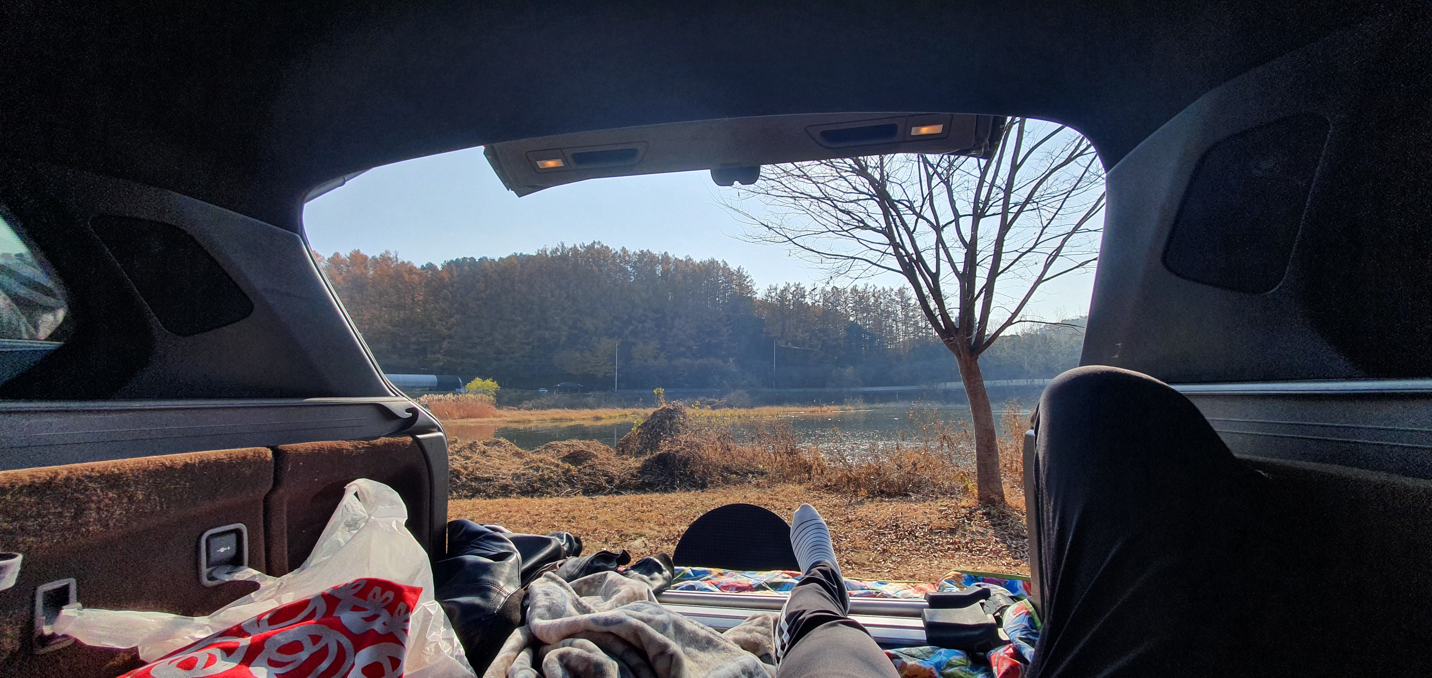 물안개공원 주차장에 차를 세워놓고 뒷자석을 평탄화 한 이후 아웃트렁크를 꺼내놨습니다. 물안개 공원이 4.5키로 정도인데 10바퀴 돌면 운동이 조금 되겠더군요 (평지만 있어서 많이 될것 같지는 않습니다.)