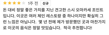 방문자들은 이곳이 미들급 스시야 중에서도 가성비가 뛰어난 곳이라 평가하며, 런치 오마카세 기준으로 ₩40,000~80,000의 다양한 가격대에서 맛과 서비스를 즐길 수 있습니다. 조용한 분위기 덕분에 데이트 장소로도 적합하며, 가족 및 친구들과의 식사 자리에도 추천됩니다.