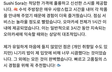 스시소라 대치점은 서울 강남구 대치동에 위치한 가성비 좋은 오마카세 스시 전문점입니다. 런치와 디너 오마카세 코스로 다양한 스시와 요리를 제공하며, 참치, 광어, 장어 등 신선한 재료로 만든 고퀄리티 스시를 합리적인 가격에 즐길 수 있습니다. 편안하고 프라이빗한 분위기 속에서 셰프의 친절한 설명과 함께 특별한 식사 경험을 제공합니다. 직원들의 친절함과 깔끔한 서비스로 전체적인 만족도가 높은 미들급 레스토랑입니다.