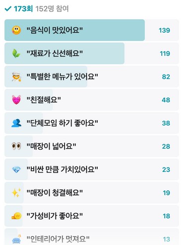 음식이 맛있다는 의견(139명), 재료가 신선(119명)하다는 의견이 포함된 키워드로 높은 만족감을 표현했고 신선한 재료와 뛰어난 맛이 이 식당의 주요 강점으로 작용하고 있음을 알 수 있어요
